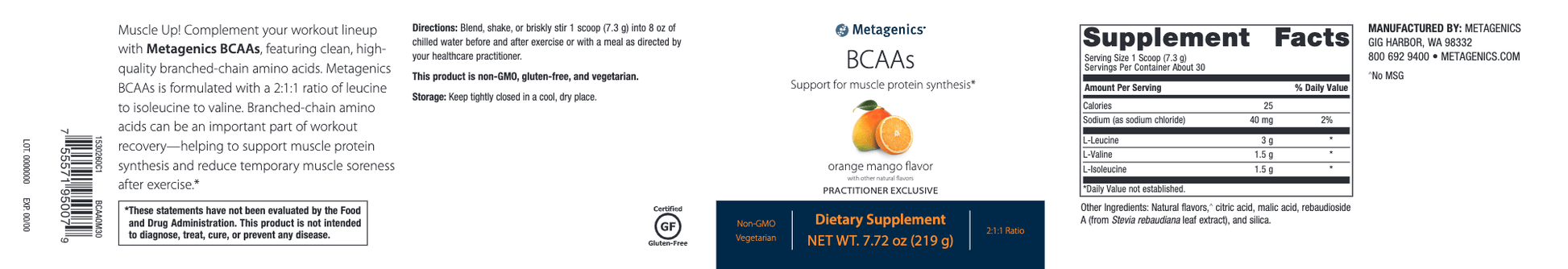 Muscle Up! Complement your workout lineup with Metagenics BCAAs, featuring clean, highquality branched-chain amino acids. Metagenics BCAAs is formulated with a 2:1:1 ratio of leucine to isoleucine to valine. Branched-chain amino acids can be an important part of workout recovery—helping to support muscle protein synthesis and reduce temporary muscle soreness after exercise.