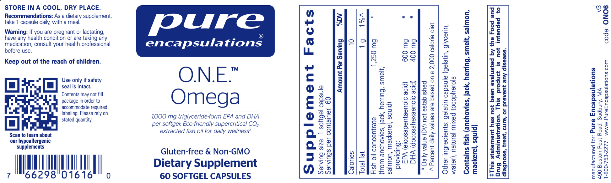 O.N.E.™ Omega offers 1,000 mg of EPA/DHA in each soft-gel, twice the potency of other fish oils, providing powerful omega-3 fatty acid support for cardiovascular, joint, cognitive and skin health. Each soft-gel contains fish oil produced through a unique solvent-free, supercritical CO2-based extraction method. This method utilizes a low-temperature, oxygen-free process to prevent oxidation reactions, resulting in pure, concentrated fish oil.*