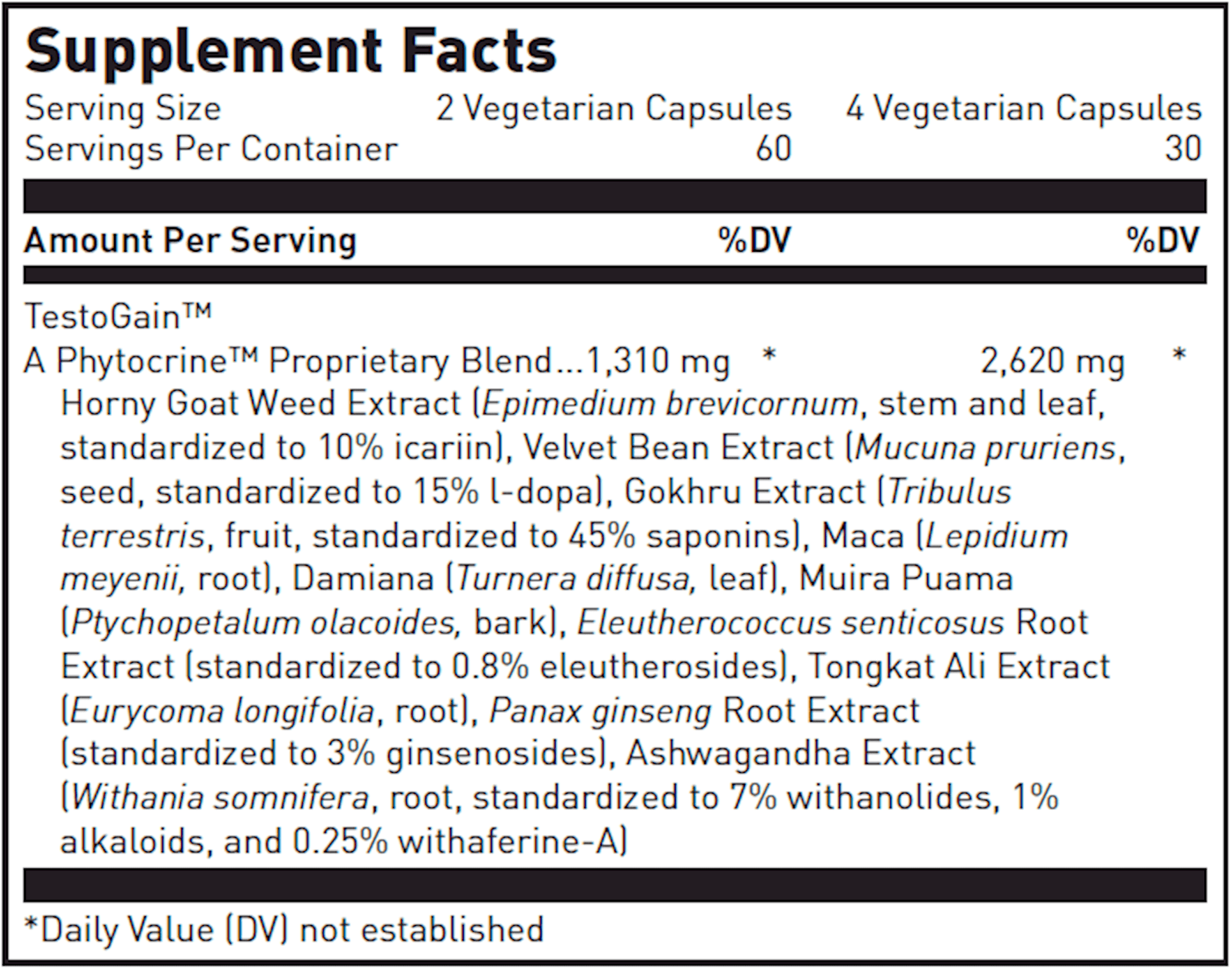 Promotes optimal testosterone function for men and women *TestoGain™ is a Hormone Specific™ Formulation of adaptogens and phytochemicals that support androgen signaling through a variety of mechanisms. This formula is designed to help to support the health of testosterone-producing glands and testosterone-responsive tissues.*